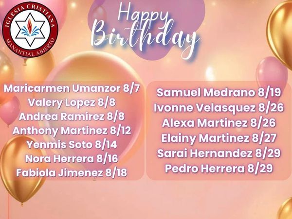 Saludamos a todos los cumpleañeros del mes de Agosto. Que Dios les bendiga grandemente.
